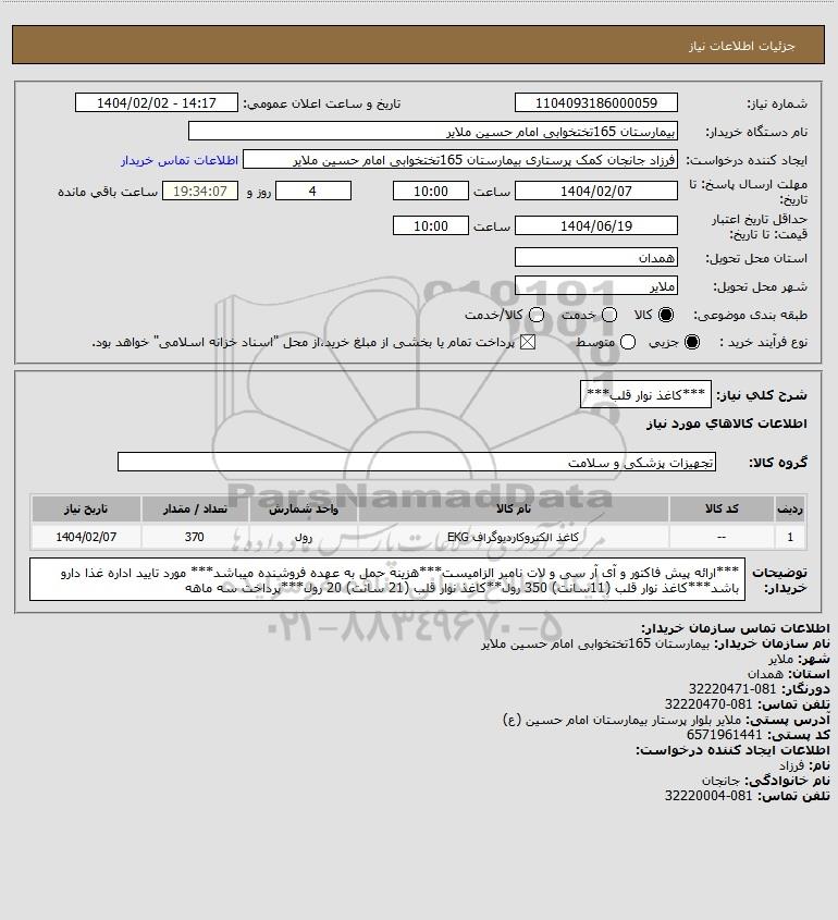 نام دستگاه خریدار:بیمارستان 165تختخوابی امام حسین ملایر