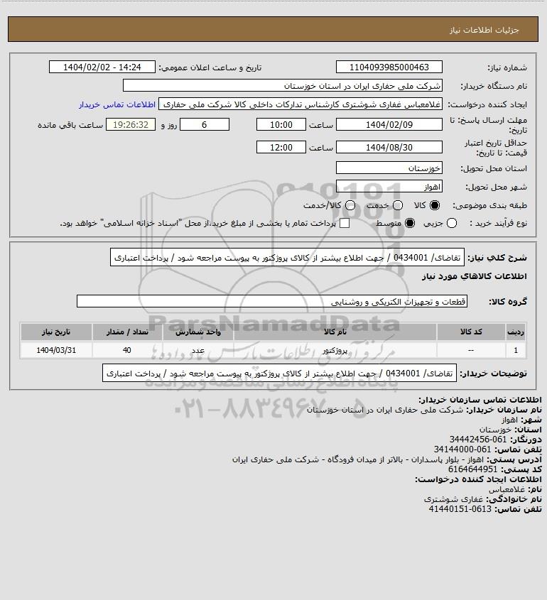 شرح کلی نیاز: تقاضای/ 0434001 / جهت اطلاع بیشتر از کالای پروژکتور به پیوست مراجعه شود / پرداخت اعتباری