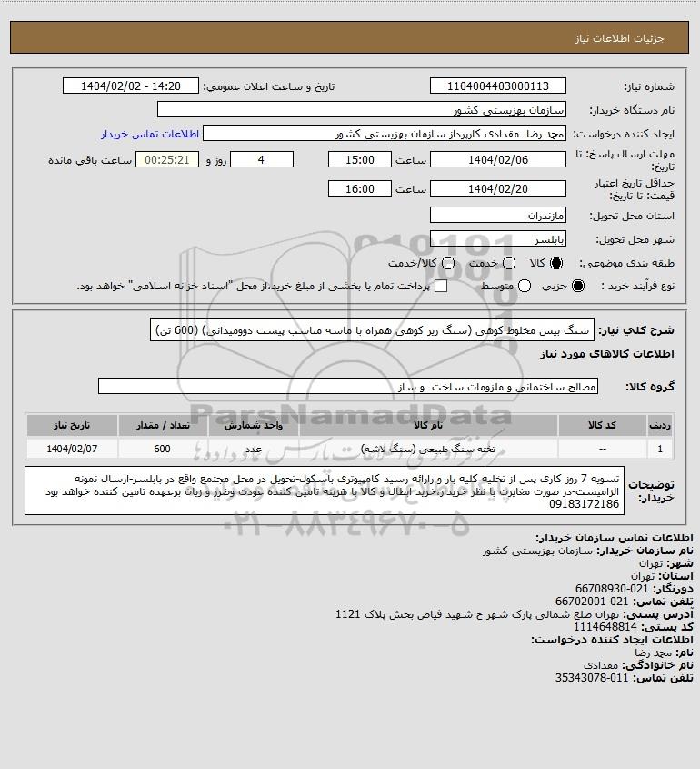 | 1 | -- | تخته سنگ طبیعی (سنگ لاشه) | عدد | 600 | 1404/02/07 |