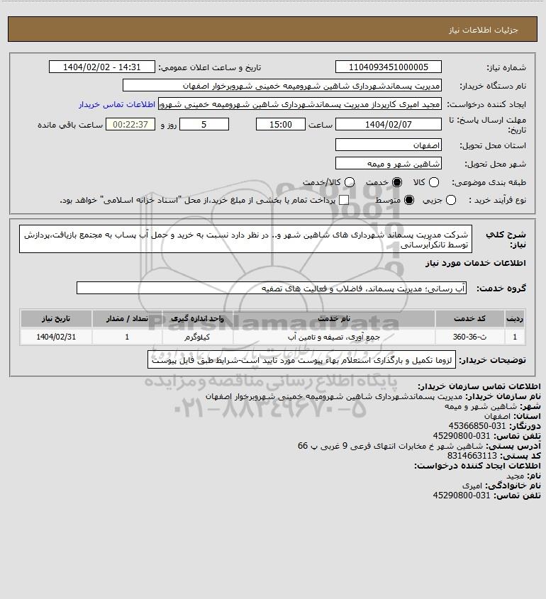 شرح کلی نیاز: شرکت مدیریت پسماند شهرداری های شاهین شهر و.. در نظر دارد نسبت به خرید و حمل آب پساب به مجتمع بازیافت،پردازش توسط تانکرآبرسانی