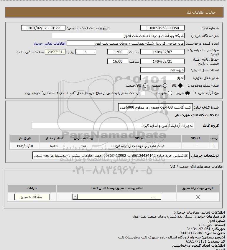 استعلام کیت کاست FOBخون مخفی در مدفوع 6000عدد, استعلام کیت کاست FOBخون مخفی در مدفوع 6000عدد