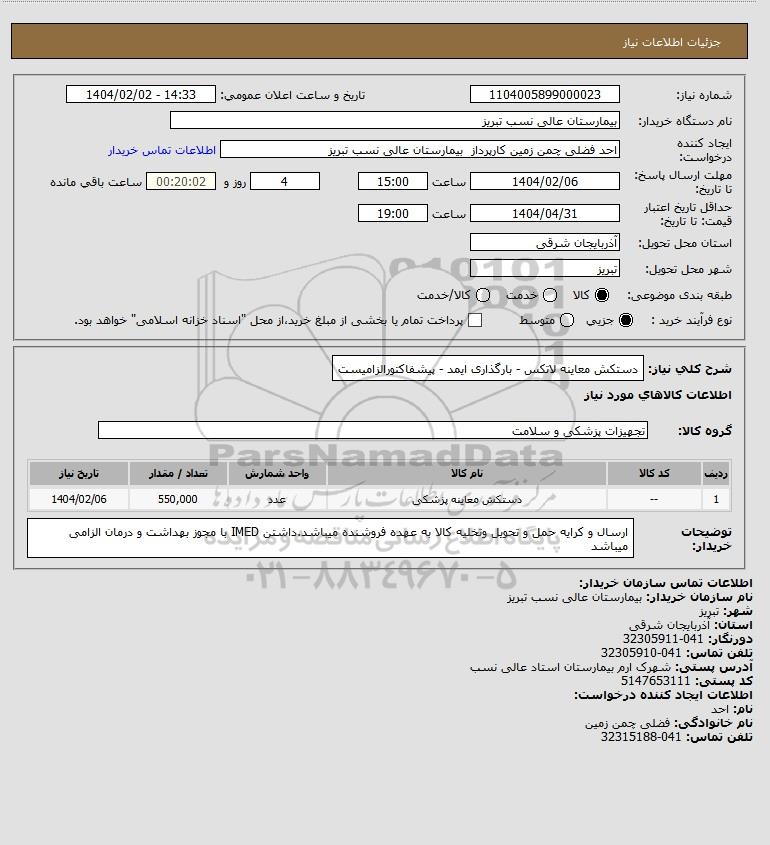 | 1 | -- | دستکش معاینه پزشکی | عدد | 550,000 | 1404/02/06 |