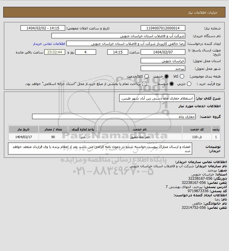 شرح کلی نیاز: استعلام حفاری چاه دستی زین آباد شهر طبس.