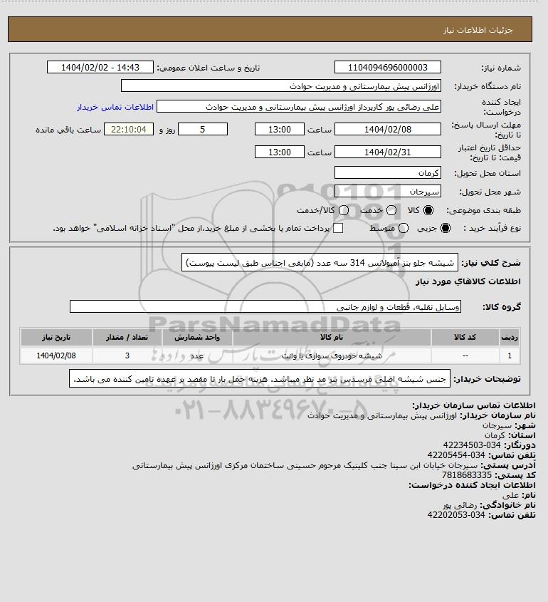 شرح کلی نیاز: شیشه جلو بنز آمبولانس 314 سه عدد (مابقی اجناس طبق لیست پیوست)