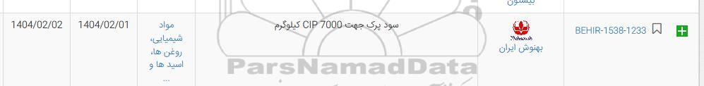 | BEHIR-1538-1233 | بهنوش ایران | سود پرک جهت cip 7000 کیلوگرم | مواد شیمیایی، روغن ها ، اسیدها و ... | 1404.2.1 | 1404.2.2 |