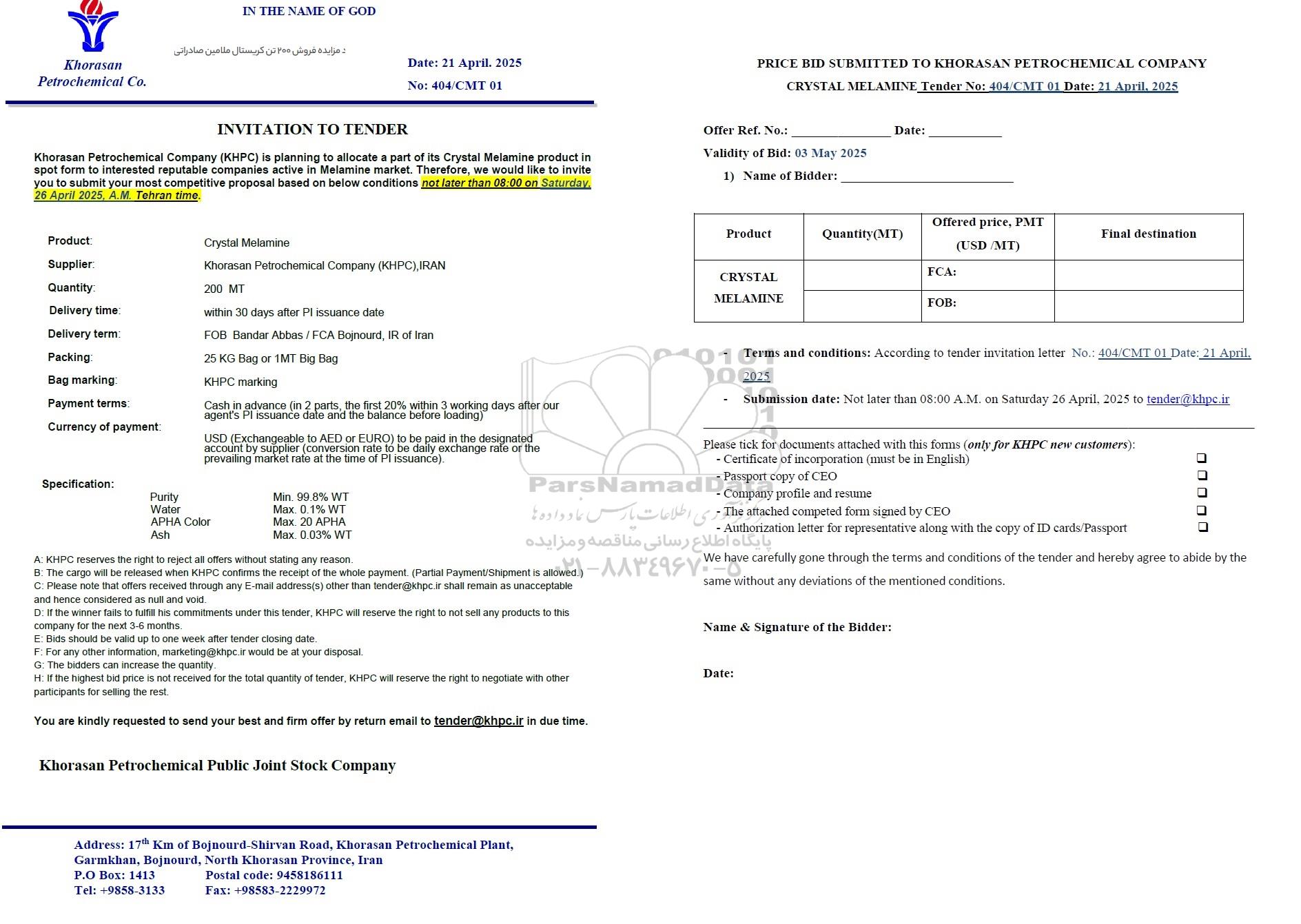 Khorasan Petrochemical Company (KHPC) is planning to allocate a part of its Crystal Melamine product in spot form to interested reputable companies active in Melamine market. Therefore, we would like to invite you to submit your most competitive proposal based on below conditions not later than 08:00 on Saturday 26 April 2025, A.M. Tehran time.