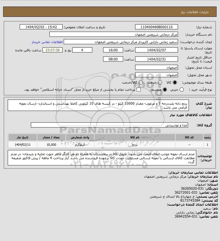 شرح کلی نیاز: برنج دانه بلنددرجه 1 و مرغوب- مقدار 10000 کیلو - در کیسه های 10 کیلویی کاملا بهداشتی و استاندارد- ارسال نمونه الزامی می باشد