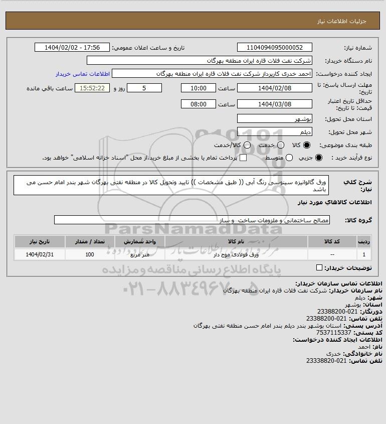 | 1 | -- | ورق فولادی موج دار | متر مربع | 100 | 1404/02/31 |