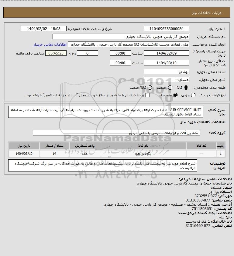 شرح کلی نیاز: AIR SERVICE UNIT - لطفا جهت ارائه پیشنهاد فنی صرفا به شرح تقاضای پیوست مراجعه فرمایید. عنوان ارائه شده در سامانه ستاد الزاما دقیق نیست.