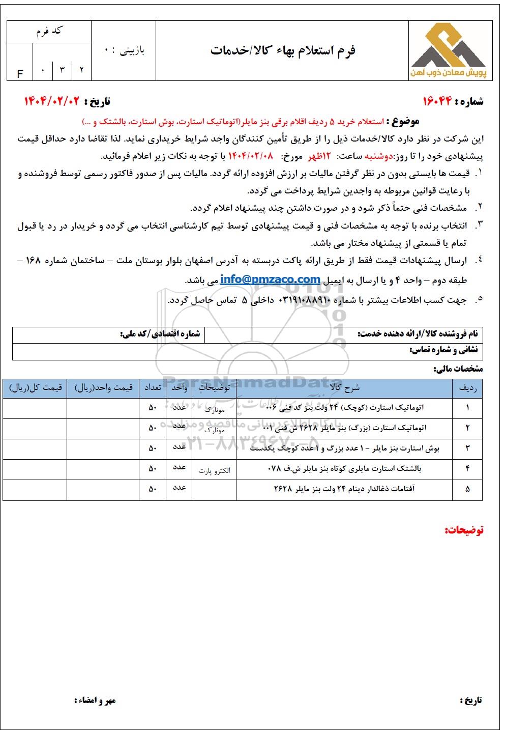 موضوع: استعلام خرید 5 ردیف اقلام برقی بنز مایلر (اتوماتیک استارت، بوش استارت، بالشتک و...)