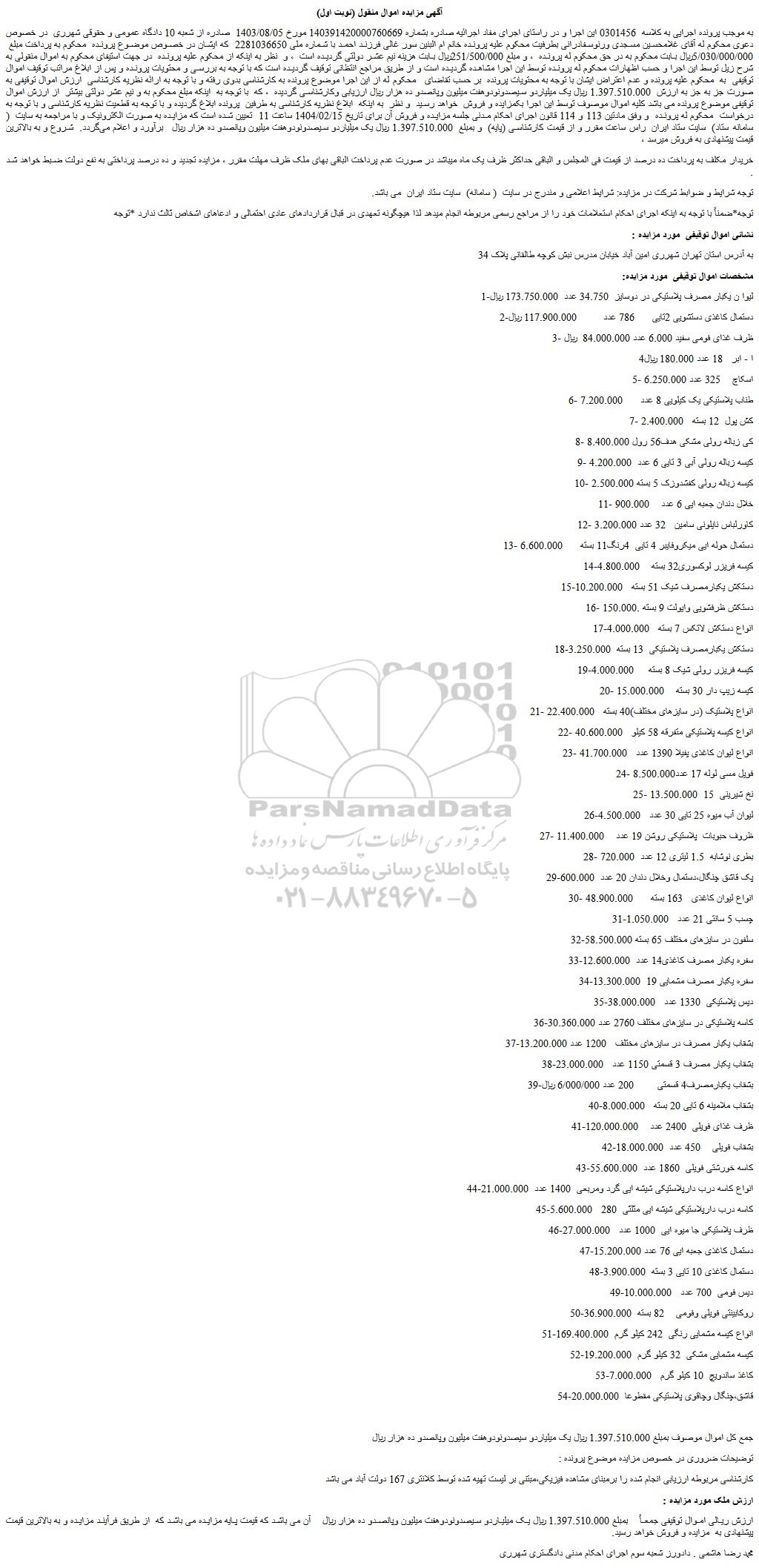 به موجب پرونده اجرایی به کلاسه 0301456 این اجرا و در راستای اجرای مفاد اجرائیه صادره بشماره 140391420000760669 مورخ 1403/08/05 صادره از شعبه 10 دادگاه عمومی و حقوقی شهرری در خصوص دعوی محکوم له آقای غلامحسین مسجدی ورنوسفادرانی بطرفیت محکوم علیه پرونده خانم ام البنین سور غالی فرزند احمد با شماره ملی 2281036650 که ایشان در خصوص موضوع پرونده محکوم به پرداخت مبلغ 5/030/000/000ریال بابت محکوم به در حق محکوم له پرونده ، و مبلغ 251/500/000ریال بابت هزینه نیم عشر دولتی گردیده است ، و نظر به اینکه از محکوم علیه پرونده در جهت استیفای محکوم به اموال منقولی به شرح زیل توسط این اجرا و حسب اظهارات محکوم له پرونده توسط این اجرا مشاهده گردیده است و از طریق مراجع انتظانی توقیف گردیده است که با توجه به بررسی و محتویات پرونده و پس از ابلاغ مراتب توقیف اموال توقیفی به محکوم علیه پرونده و عدم اعتراض ایشان با توجه به محتویات پرونده بر حسب تقاضای محکوم له از این اجرا موضوع پرونده به کارشناسی بدوی رفته و با توجه به ارائه نظریه کارشناسی ارزش اموال توقیفی به صورت جز به جز به ارزش 1.397.510.000 ریال یک میلیاردو سیصدونودوهفت میلیون وپانصدو ده هزار ریال ارزیابی وکارشناسی گردیده ، که با توجه به اینکه مبلغ محکوم به و نیم عشر دولتی بیشتر از ارزش اموال توقیفی موضوع پرونده می باشد کلیه اموال موصوف توسط این اجرا بکمزایده و فروش خواهد رسید و نظر به اینکه ابلاغ نظریه کارشناسی به طرفین پرونده ابلاغ گردیده و با توجه به قطعیت نظریه کارشناسی و با توجه به درخواست محکوم له پرونده و وفق مادتین 113 و 114 قانون اجرای احکام مدنی جلسه مزایده و فروش آن برای تاریخ 1404/02/15 ساعت 11 تعیین شده است که مزایده به صورت الکترونیک و با مراجعه به سایت ( سامانه ستاد) سایت ستاد ایران راس ساعت مقرر و از قیمت کارشناسی (پایه) و بمبلغ 1.397.510.000 ریال یک میلیاردو سیصدونودوهفت میلیون وپانصدو ده هزار ریال برآورد و اعلام می گردد. شروع و به بالاترین قیمت پیشنهادی به فروش میرسد ،
