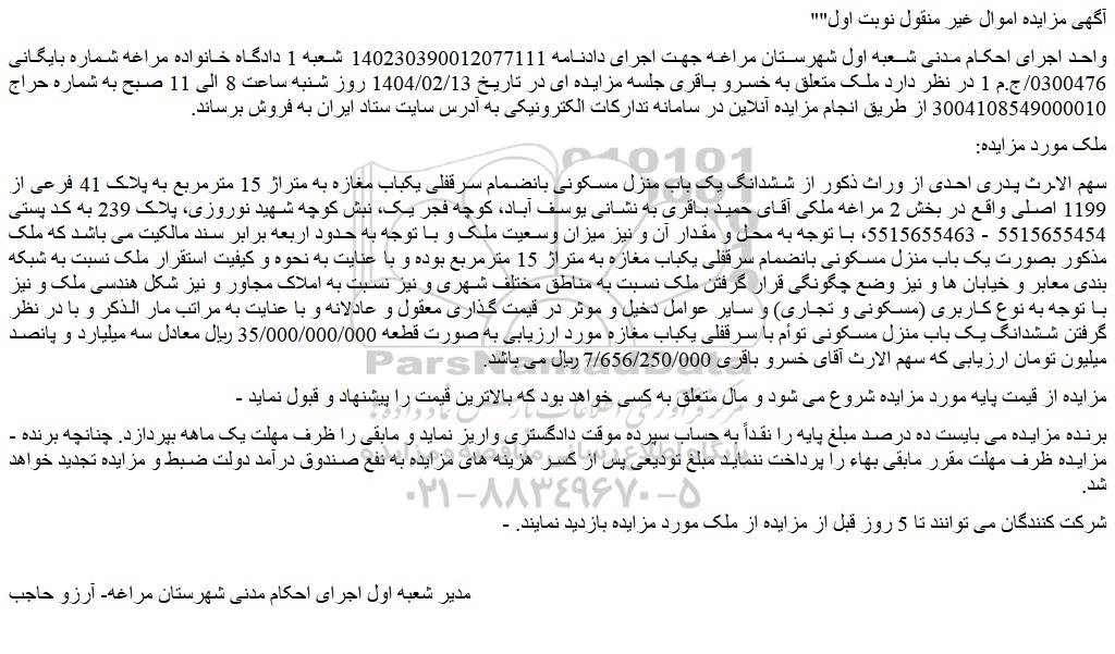 واحد اجرای احکام مدنی شعبه اول شهرستان مراغه جهت اجرای دادنامه 140230390012077111 شعبه 1 دادگاه خانواده مراغه شماره بایگانی 0300476/ج.م 1 در نظر دارد ملک متعلق به خسرو باقری جلسه مزایده ای در تاریخ 1404/02/13 روز شنبه ساعت 8 الی 11 صبح به شماره حراج 3004108549000010 از طریق انجام مزایده آنلاین در سامانه تدارکات الکترونیکی به آدرس سایت ستاد ایران به فروش برساند.
