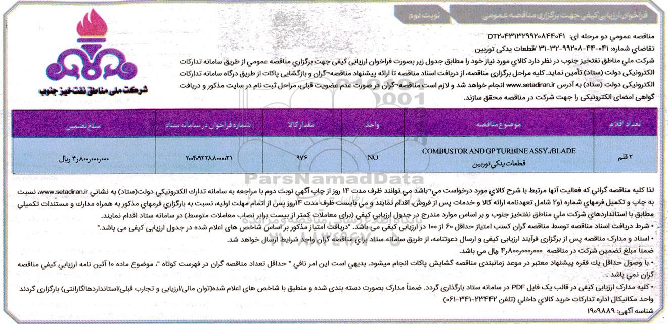 فراخوان ارزیابی کیفی مناقصه combustor and gp turbine assy/blade - نوبت دوم از کلیه افراد متخصص و شرکتها واجد شرایط دعوت به عمل میآید در مناقصه با کد خبرگزاری پارس نماد: 8914851 شرکت نمایند.