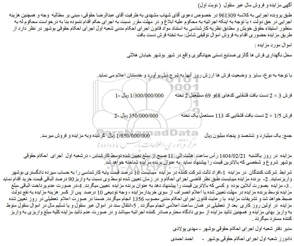 طبق پرونده اجرایی به کلاسه 961309 در خصوص دعوی آقای شهاب مشهدی به طرفیت آقای عبدالرضا حقوقی، مبنی بر مطالبه وجه و همچنین هزینه اجرایی در حق دولت ؛ با توجه به اینکه اجرائیه به محکوم علیه ابلاغ و در مهلت مقرر نسبت به اجرای حکم اقدام ننموده بنا به درخواست محکوم له به منظور استیفاء حقوق خویش و مطابق نظریه کارشناسی به استناد مواد قانون اجرای احکام مدنی شعبه اول اجرای احکام حقوقی بوشهر در نظر دارد از طریق مزایده حضوری اقدام به فروش اموال توقیفی شامل: سه تخته فرش دست بافت