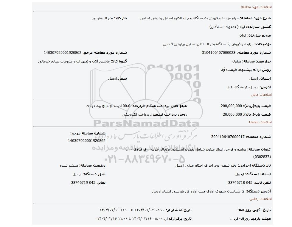 شماره مورد معامله: 3104106407000023 | شماره مورد معامله مرجع: 140307920001920862 | |
