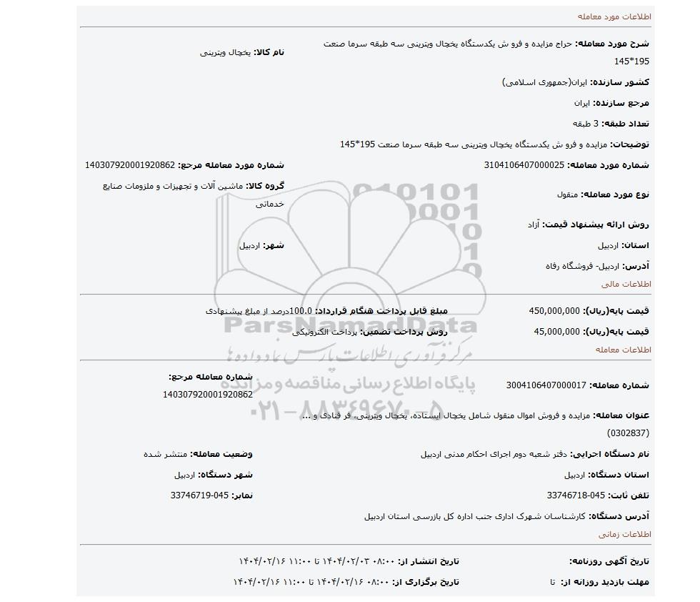 📞 برای دریافت اطلاعات بیشتر در خصوص، حراج، حراجی، فروش اقلام مازاد، واگذاری تجهیزات، فروش اموال مازاد، فروش دستگاه‌های دست دوم، فروش ماشین‌آلات کارکرده، مزایده عمومی، مزایده آنلاین، خرید به ارزانترین قیمت و فروش با بالاترین قیمت لطفاً با سامانه مناقصات و مزایدات ایران پارس نماد داده‌ها به شماره 88349670 تماس حاصل فرمایید.
