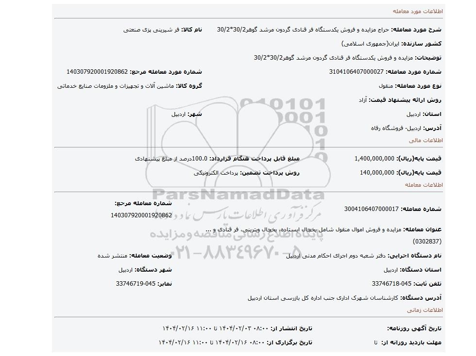 نام دستگاه اجرایی: دفتر شعبه دوم اجرای احکام مدنی اردبیلوضعیت معامله: منتشر شده
