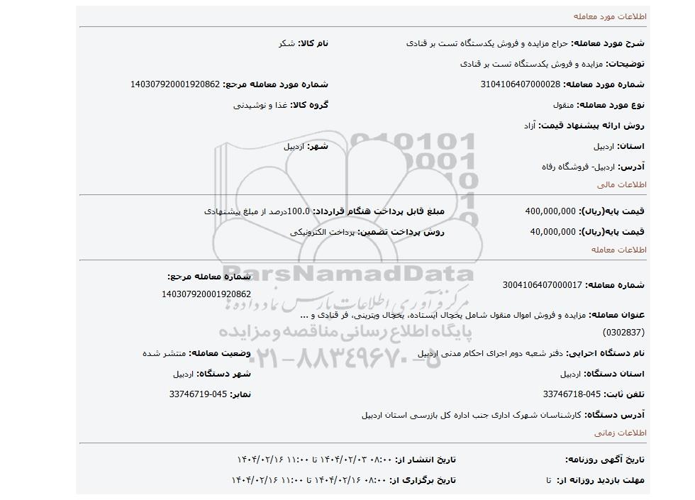 شرح مورد معامله: حراج مزایده و فروش یکدستگاه تست بر قنادی | نام کالا: شکر | |