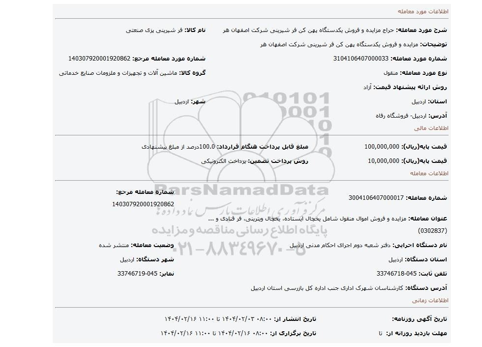 شماره مورد معامله: 3104106407000033شماره مورد معامله مرجع: 140307920001920862