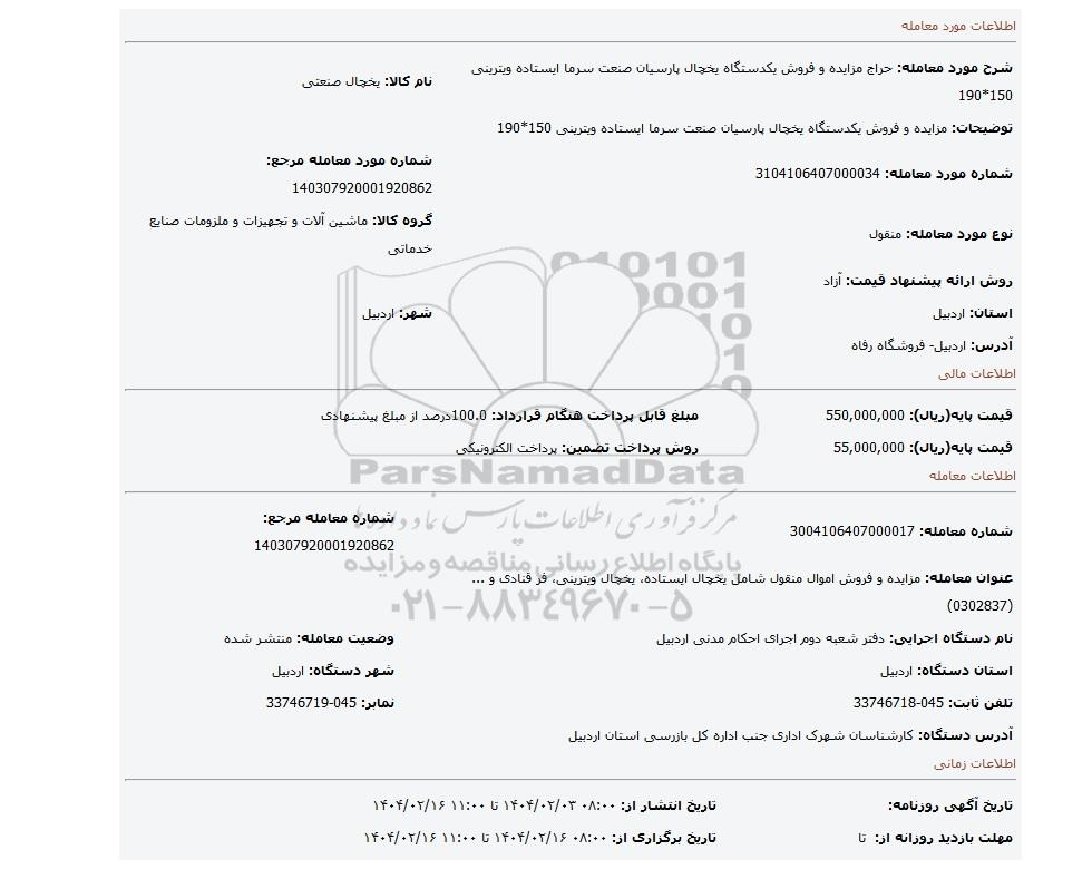 شرح مورد معامله: حراج مزایده و فروش یکدستگاه یخچال پارسیان صنعت سرما ایستاده ویترینی 150*190 | نام کالا: یخچال صنعتی | |