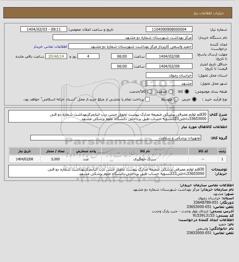 نام دستگاه خریدار:مرکز بهداشت شهرستان شماره دو مشهد