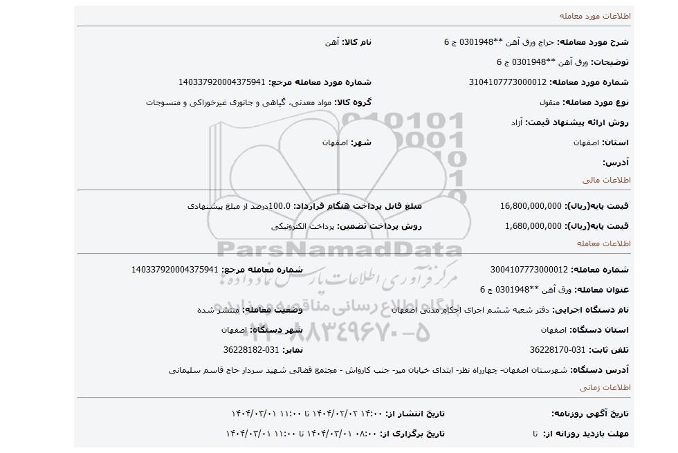 | عنوان معامله: ورق آهن **0301948 ج 6 | ||