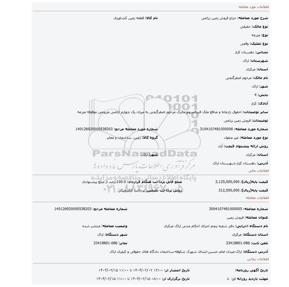 | شرح مورد معامله: حراج فروش زمین زراعی | نام کالا: قطعه زمین کشاورزی | |