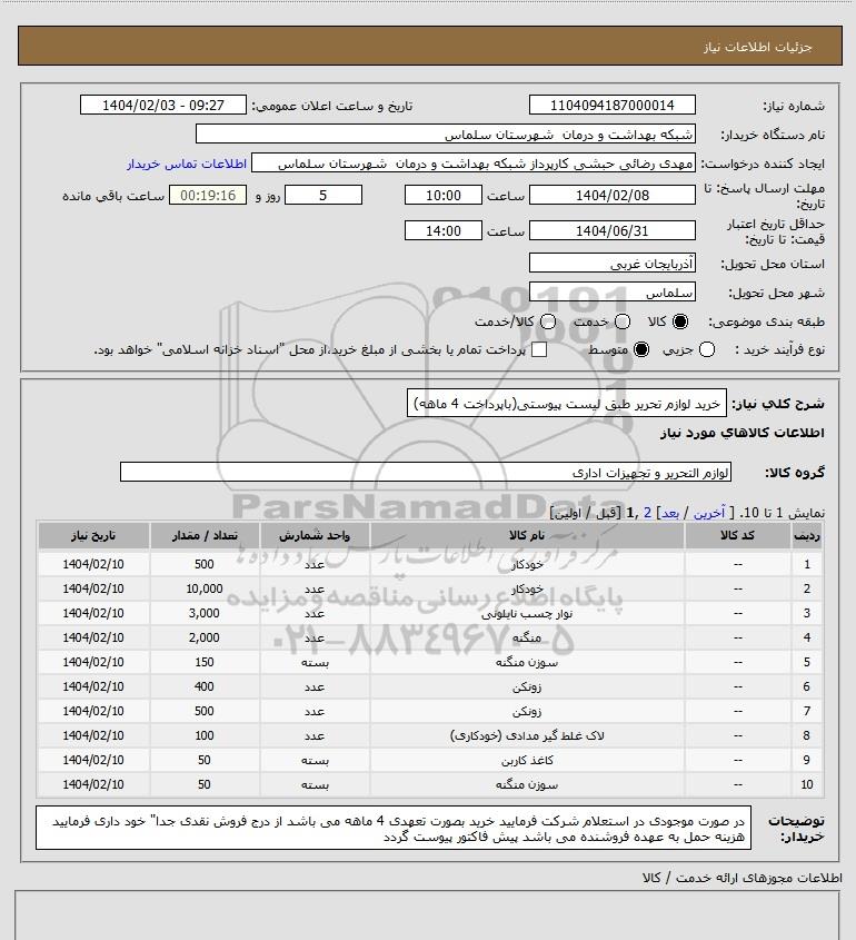 شرح کلی نیاز: خرید لوازم تحریر طبق لیست پیوستی(باپرداخت 4 ماهه)