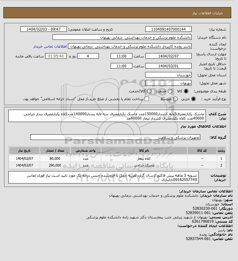 | 2 | -- | ماسک جراحی | عدد | 290,000 | 1404/02/07 |
