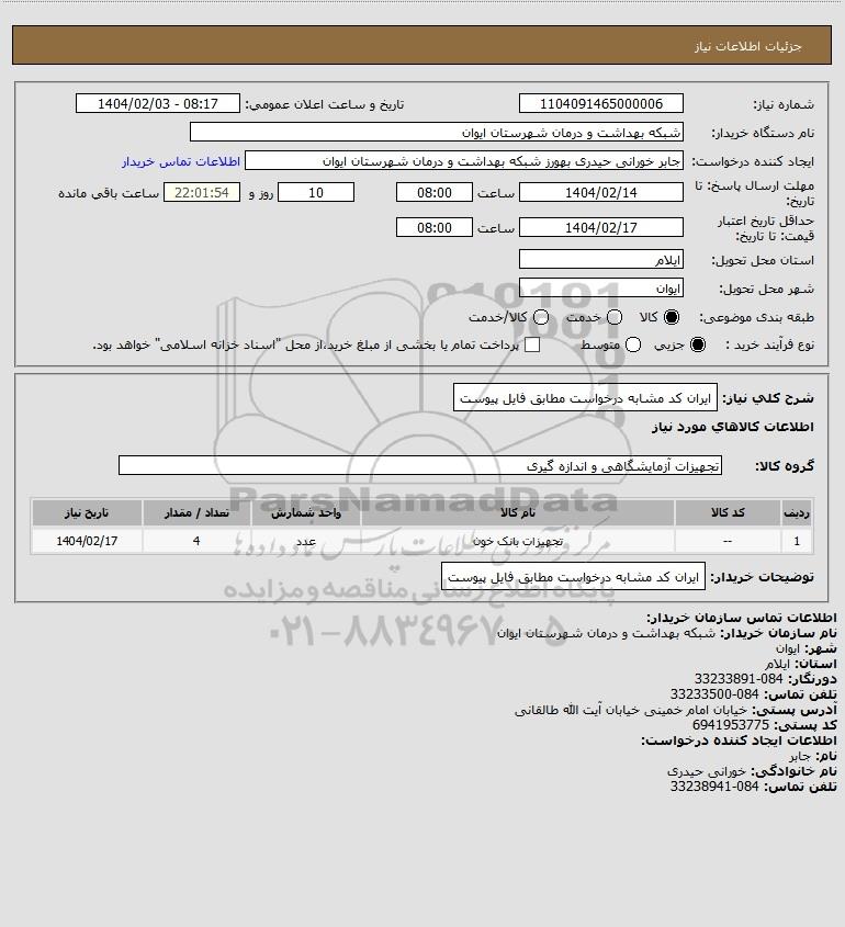 استعلام بها و موضوع استعلام استعلام ایران کد مشابه درخواست مطابق فایل پیوست به اطلاع کلیه شرکت‌ها و افراد متخصص واجد شرایط می‌رساند، آگهی گذار در نظر دارد از طریق استعلام بها، نسبت به انتخاب و دریافت پیشنهادات اقدام نماید. این استعلام با کد آگهی ثبت شده در سامانه خبرگزاری پارس نماد : 8916186 منتشر شده است. مشخصات استعلام : تاریخ شروع استعلام: 1404/02/03 آخرین مهلت ارسال پیشنهاد قیمت : 1404/02/14 و محل اجرای پروژه : استان ایلام میباشد. استعلام قیمت مورد درخواست : استعلام ایران کد مشابه درخواست مطابق فایل پیوست با دسته‌بندی‌های تخصصی و گروه های مرتبط : خدمات و تجهیزات آزمایشگاهی و پزشکی, استعلام اطلاع رسانی میگردد.