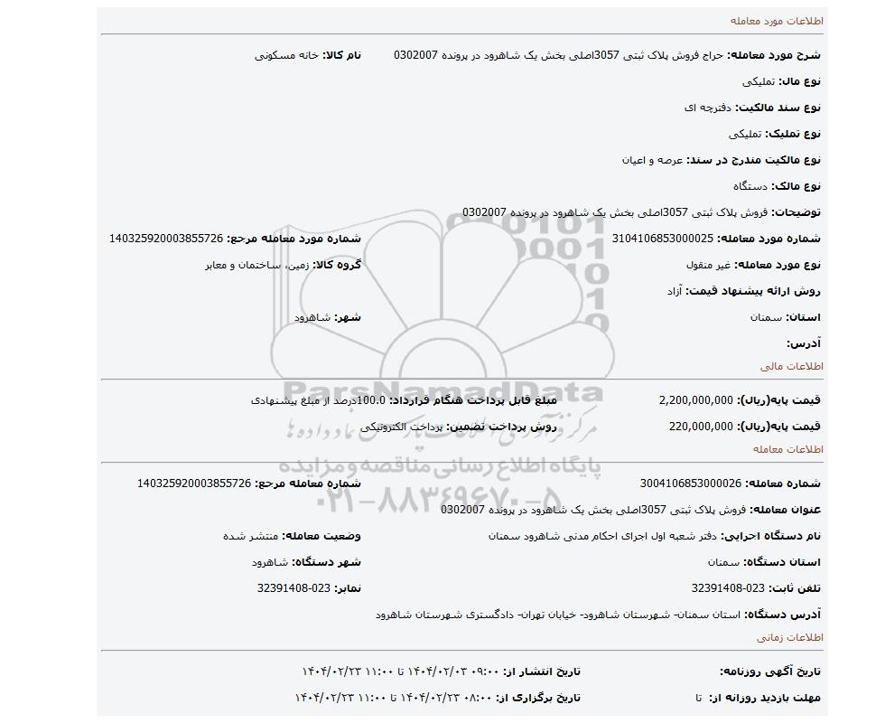 | عنوان معامله: فروش پلاک ثبتی 3057اصلی بخش یک شاهرود در پرونده 0302007 | ||