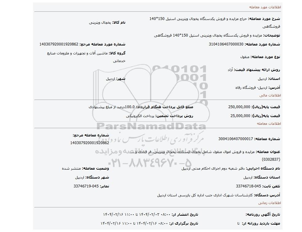 شماره مورد معامله: 3104106407000030 | شماره مورد معامله مرجع: 140307920001920862 | |
