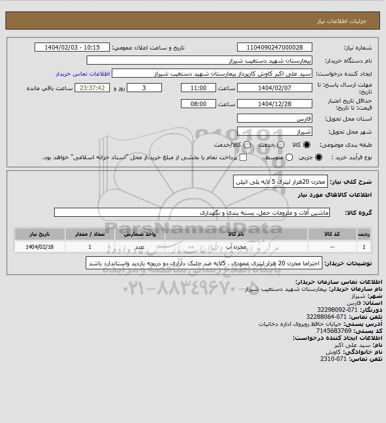 استعلام مخزن 20هزار لیتری 5 لایه پلی اتیلن, استعلام مخزن 20هزار لیتری 5 لایه پلی اتیلن