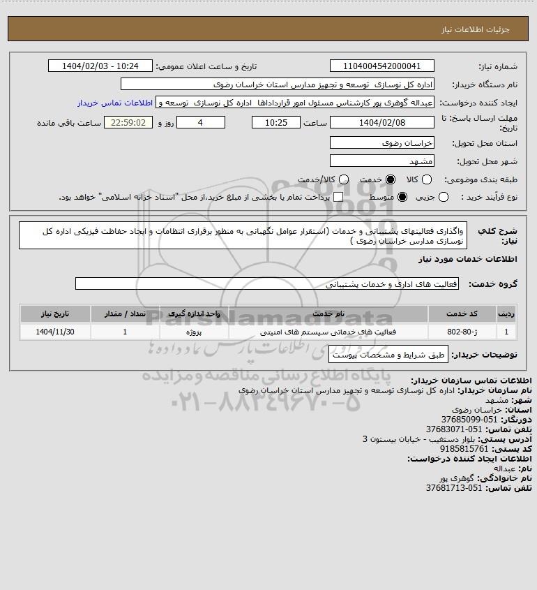 شرح کلی نیاز: واگذاری فعالیتهای پشتیبانی و خدمات (استقرار عوامل نگهبانی به منظور برقراری انتظامات و ایجاد حفاظت فیزیکی اداره کل نوسازی مدارس خراسان رضوی )