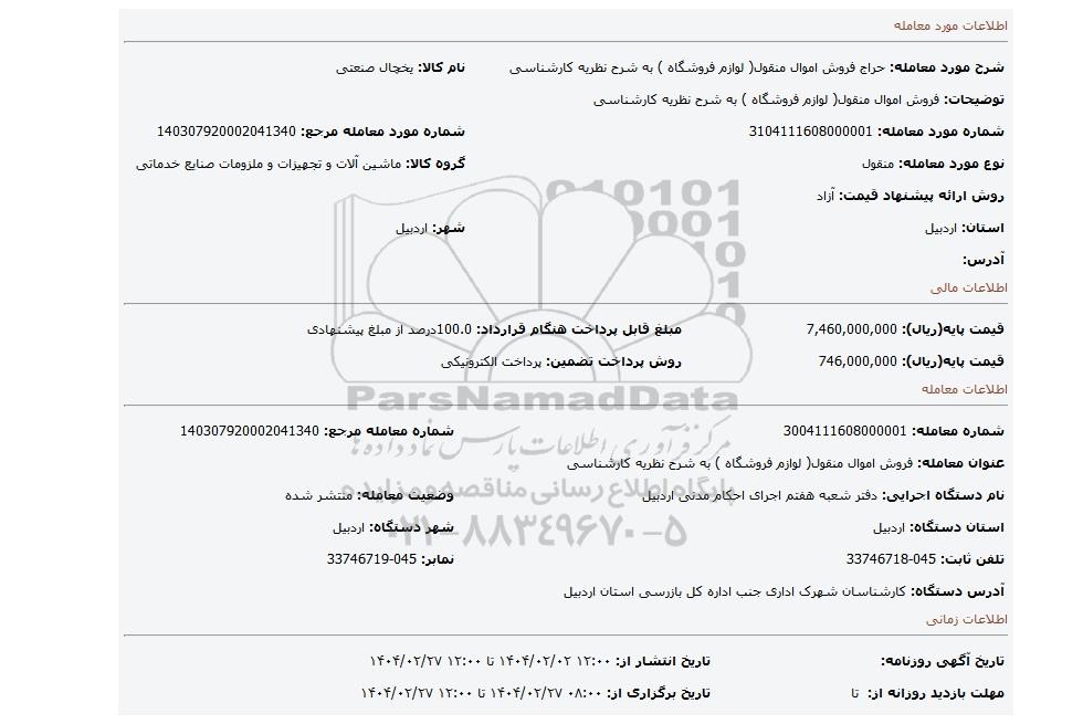 نام دستگاه اجرایی: دفتر شعبه هفتم اجرای احکام مدنی اردبیل | وضعیت معامله: منتشر شده | |