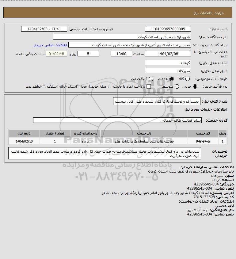 شرح کلی نیاز: بهسازی و نوسازی پارک گلزار شهداء طبق فایل پیوست