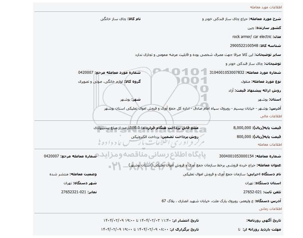 | عنوان معامله: حراج خرده فروشی برخط سازمان جمع آوری و فروش اموال تملیکی (استان بوشهر) | ||