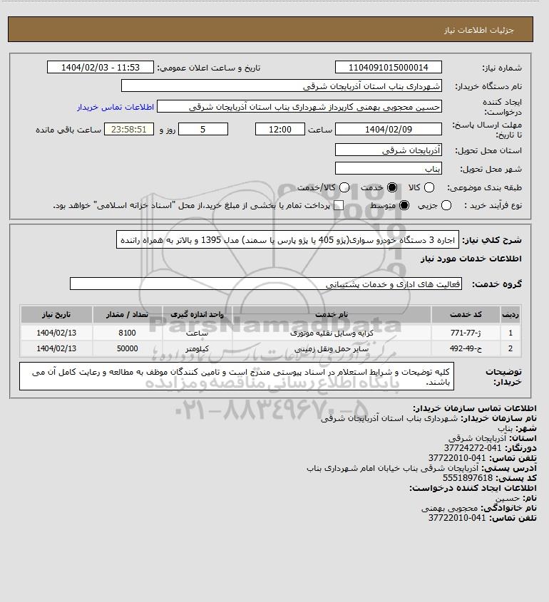 شرح کلی نیاز: اجاره 3 دستگاه خودرو سواری(پژو 405 یا پژو پارس یا سمند) مدل 1395 و بالاتر به همراه راننده