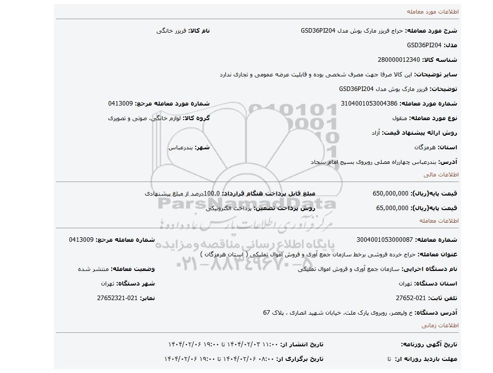| شماره مورد معامله: 3104001053004386 | شماره مورد معامله مرجع: 0413009 | |