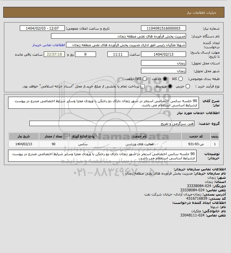 شرح کلی نیاز: 90 جلسه سانس اختصاصی استخر در شهر زنجان دارای دو رختکن با ورودی مجزا وسایر شرایط اختصاصی مندرج در پیوست ازشرایط اساسی استعلام می باشد.