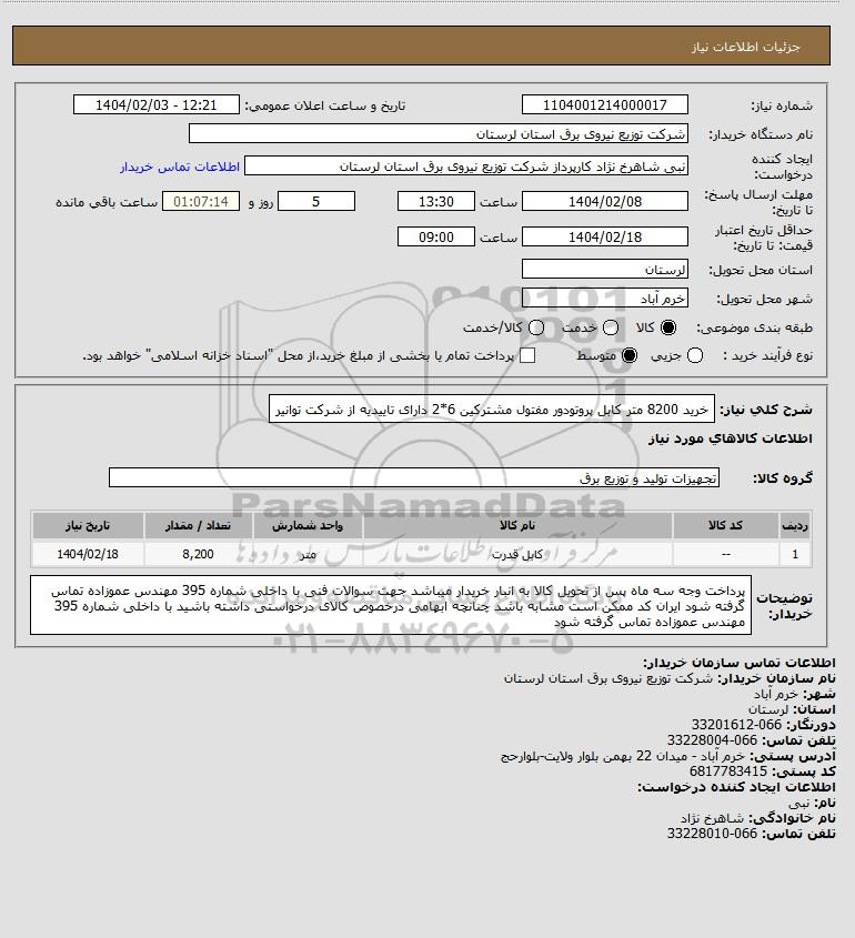 شرح کلی نیاز: خرید 8200 متر کابل پروتودور مفتول مشترکین 6*2 دارای تاییدیه از شرکت توانیر