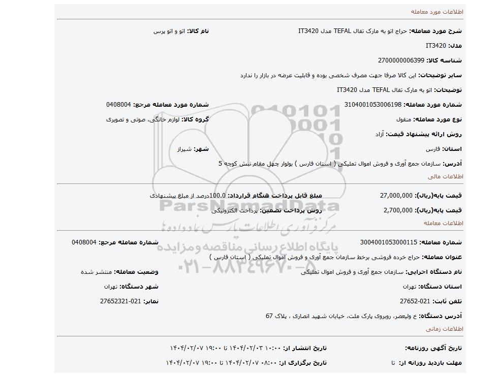 | عنوان معامله: حراج خرده فروشی برخط سازمان جمع آوری و فروش اموال تملیکی ( استان فارس ) | ||