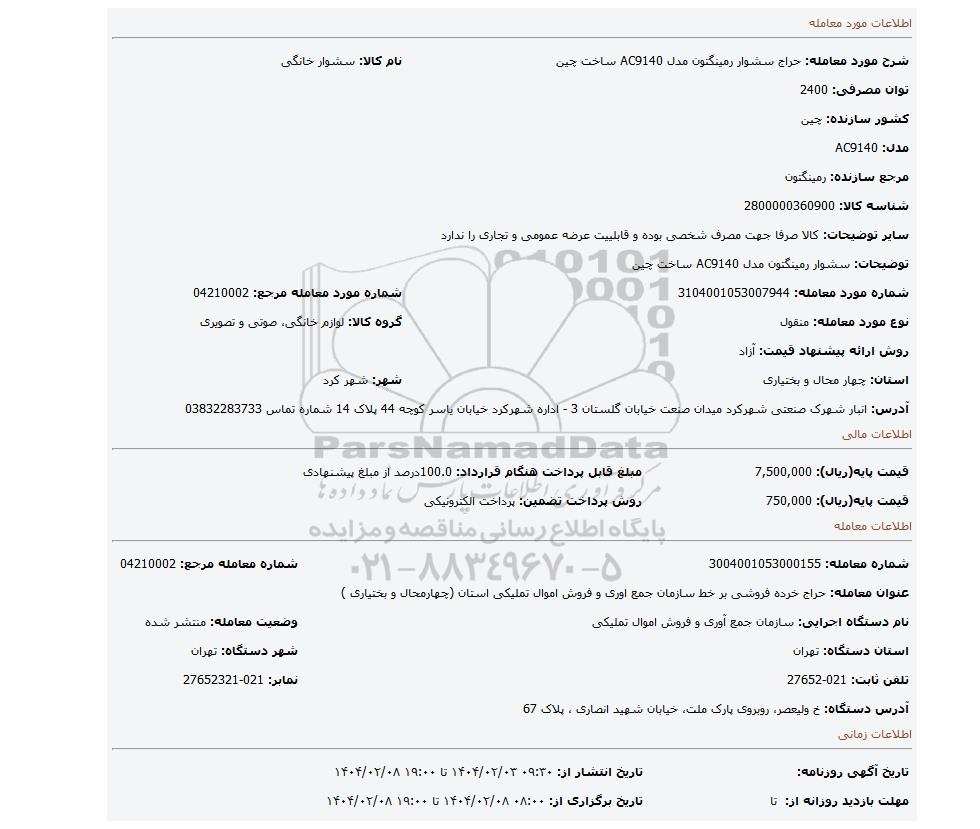 | عنوان معامله: حراج خرده فروشی بر خط سازمان جمع اوری و فروش اموال تملیکی استان (چهارمحال و بختیاری ) | ||