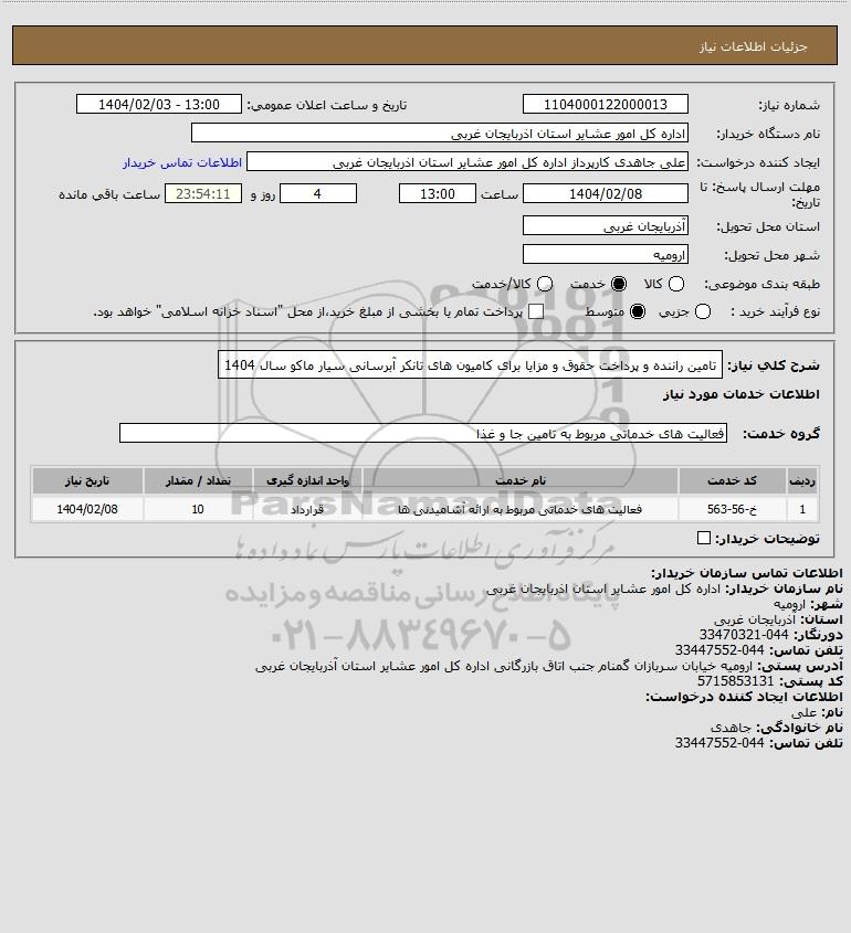 شرح کلی نیاز: تامین راننده و پرداخت حقوق و مزایا برای کامیون های تانکر آبرسانی سیار ماکو سال 1404