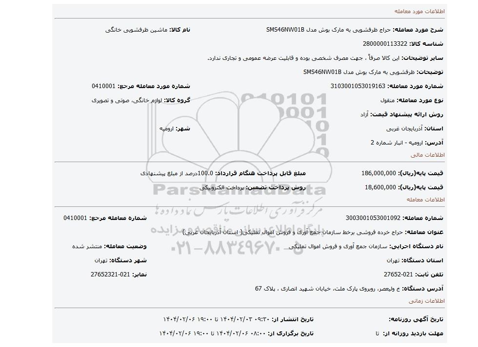 عنوان معامله: حراج خرده فروشی برخط سازمان جمع آوری و فروش اموال تملیکی( استان آذربایجان غربی)