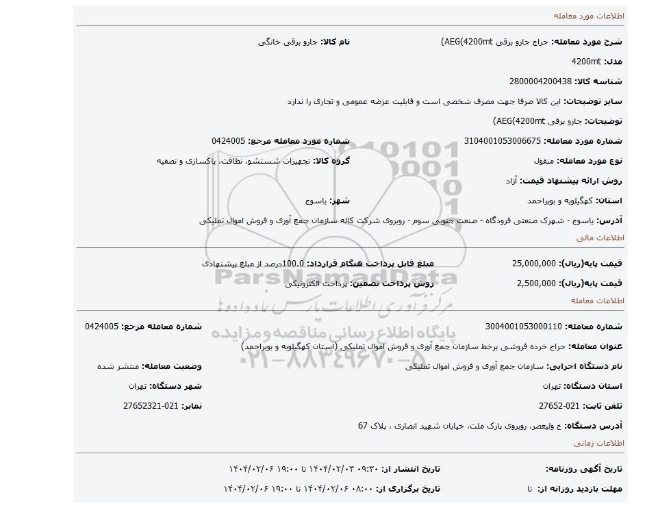 | شماره مورد معامله: 3104001053006675 | شماره مورد معامله مرجع: 0424005 | |