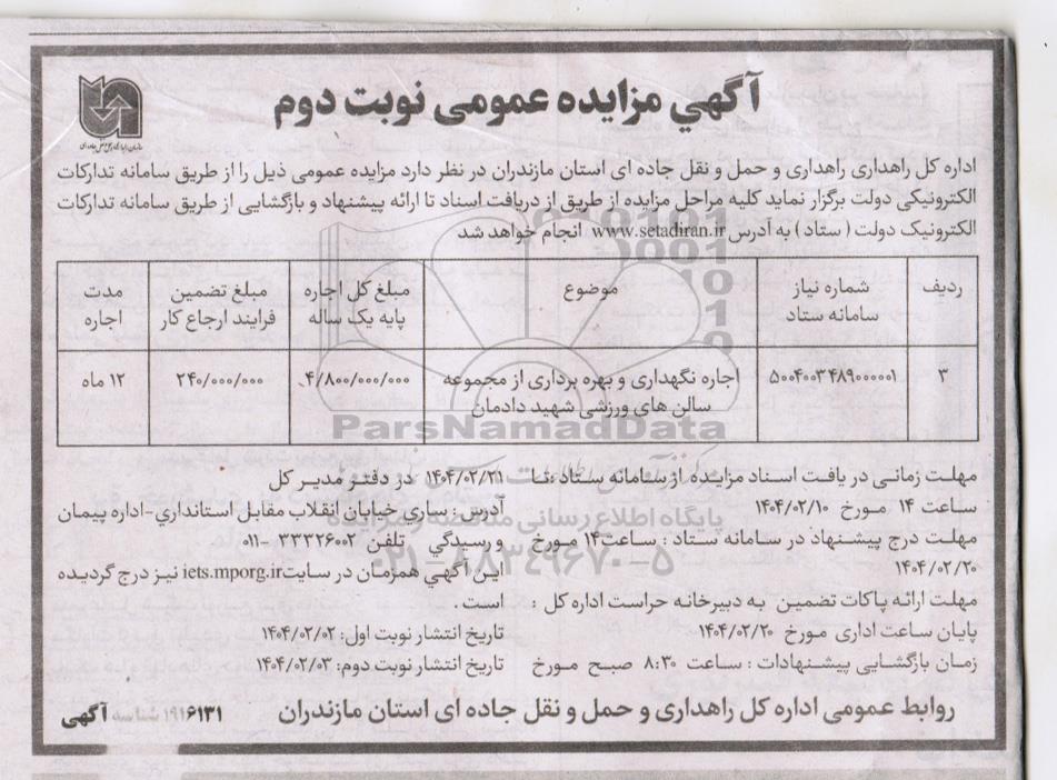 مزایده عمومی مزایده اجاره نگهداری و بهره برداری از مجموعه سالن های نوبت دوم برگزار میگردد. از کلیه افراد متخصص و شرکت‌های واجد شرایط دعوت به عمل می‌آید تا در این مزایده با کد خبرگزاری پارس نماد : 8918801 شرکت نمایند تاریخ شروع مزایده : 1404/02/03 مهلت شرکت در مزایده: تا پایان روز 1404/02/10 مکان برگزاری اموال واگذاری استان‌های مازندران و دسته‌بندی‌های مربوط به این حراجی واگذاری ورزشگاه، پارکینگ، غرفه و بوفه میباشد.