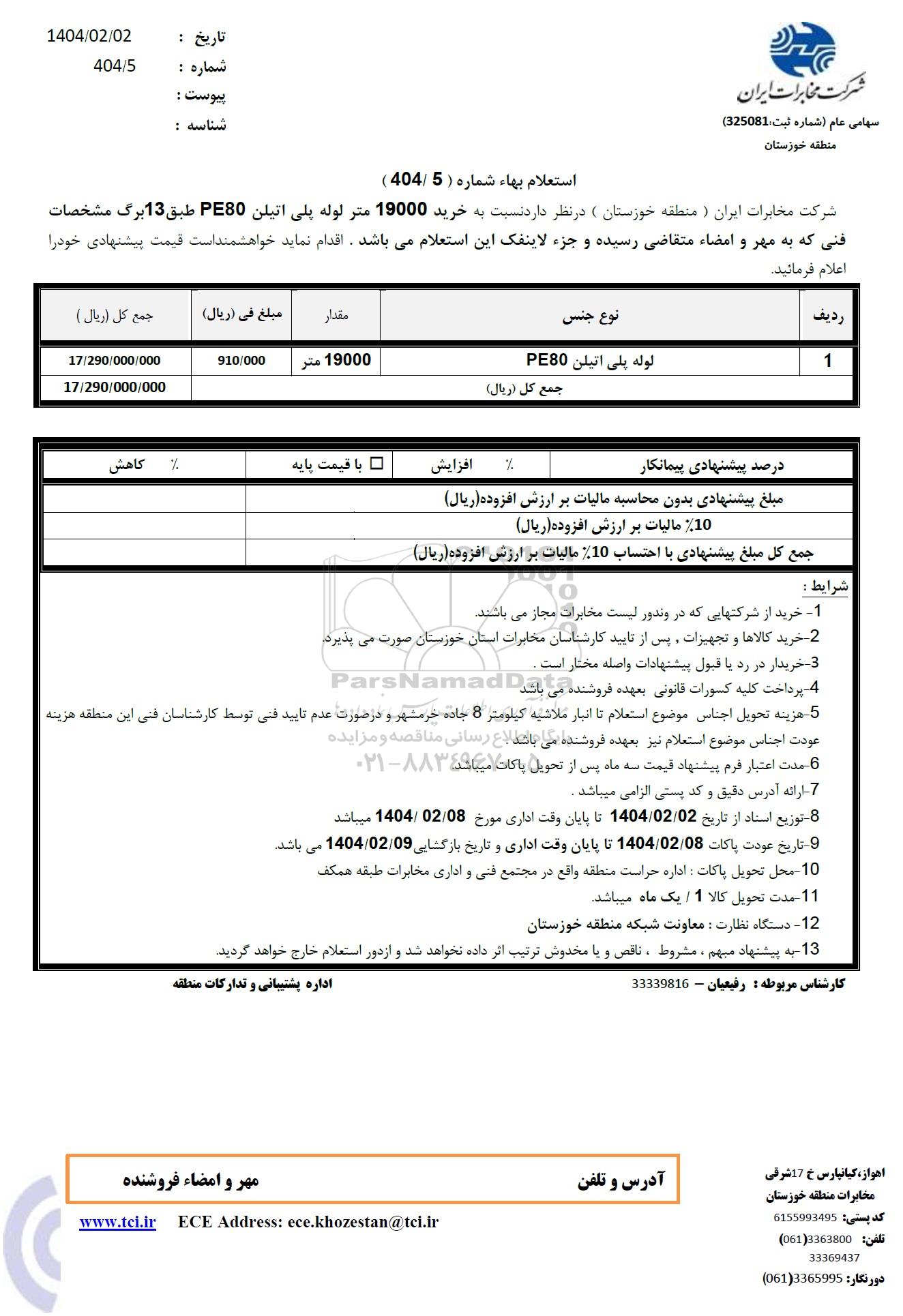 شرکت مخابرات ایران (منطقه خوزستان) در نظر دارد نسبت به خرید 19000 متر لوله پلی اتیلن pe80 طبق 13 برگ مشخصات فنی که به مهر و امضا متقاضی رسیده و جز لاینفک این استعلام میباشد اقدام نماید خواهشمند است قیمت پیشنهادی خود را اعلام فرمائید.