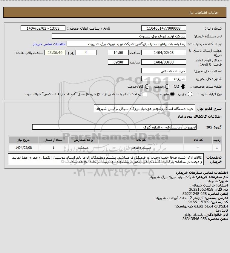 استعلام خرید دستگاه اسپکتروفتومتر موردنیاز نیروگاه سیکل ترکیبی شیروان, استعلام خرید دستگاه اسپکتروفتومتر موردنیاز نیروگاه سیکل ترکیبی شیروان