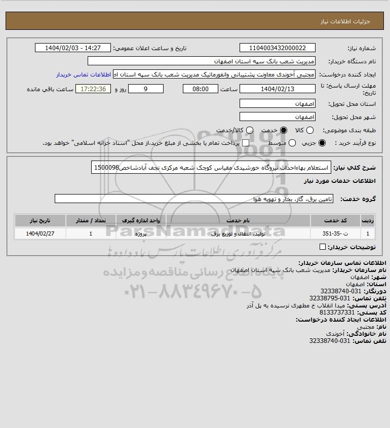 شرح کلی نیاز: استعلام بهاءاحداث نیروگاه خورشیدی مقیاس کوچک شعبه مرکزی نجف آبادشاخص1500098